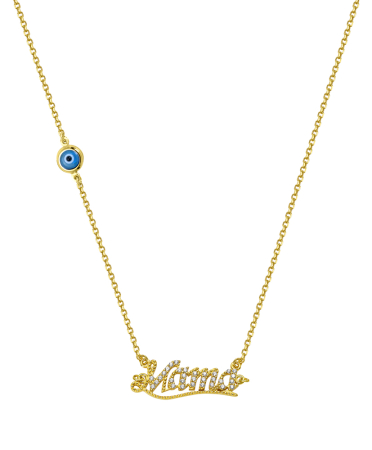 Κολιέ σε κίτρινο χρυσό με στοιχείο μάτι και τη λέξη mama με ζιργκόν