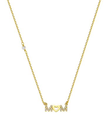 Κολιέ σε κίτρινο χρυσό με στοιχείo τη λέξη mom και ζιργκόν, διαθέσιμο και σε λευκό και ροζ χρυσό.
