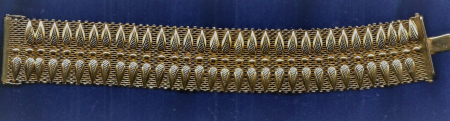 Βραχιόλι χειροποίητο Κ18 με μια κεντρική σειρά σφαιρικών σχημάτων και 2 σειρές μοτίβων που θυμίζουν φύλλα.