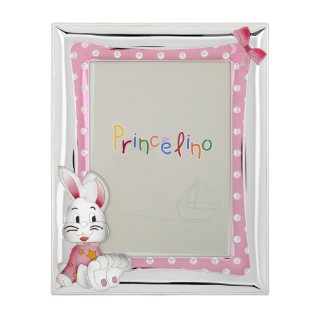 Παιδική ασημένια κορνίζα με λαγουδάκι, σε σιελ και καφέ χρώματα.