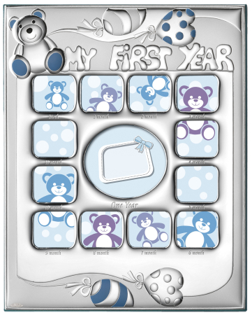 Παιδική ασημένια κορνίζα με αρκουδάκι και καρδιές "my first year".