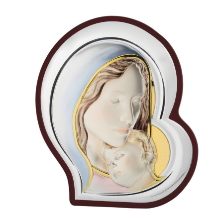 Μαντόνα με βρέφος, διαθέσιμη σε ασήμι ή σε ασήμι με χρώματα σμάλτου, με ξύλινη καφέ ή λευκή πίσω όψη.
