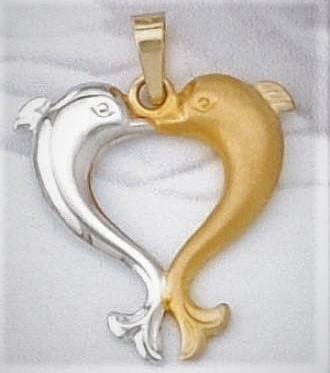 Μενταγιόν με 2 δελφίνια αντικρυστά σε σχήμα καρδιάς, σε κίτρινο και λευκό χρυσό και ποικιλία βαρών.