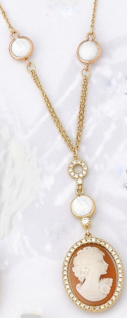 Κολιέ σε κίτρινο χρυσό με κόκκινο καμέο, φίλντισι και λευκά ζιργκόν.
