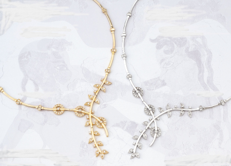 Κολιέ με φύλλα και κυκλικά στοιχεία σε κίτρινο χρυσό με λευκά ζιργκόν.