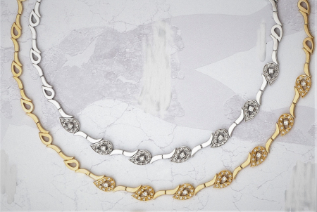 Κολιέ με λευκά ζιργκόν και μοτίβα "σταγόνες" σε κίτρινο ή λευκό χρυσό.