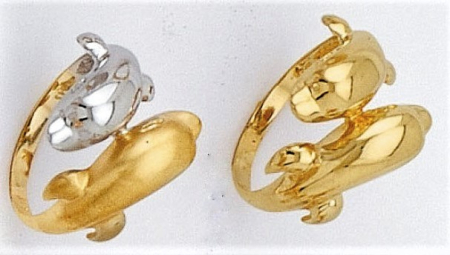 Δακτυλίδι με δελφίνια αντικρυστά σε δίχρωμο ή κίτρινο χρυσό, διαθέσιμο σε ποικιλία βαρών και μεγεθών.