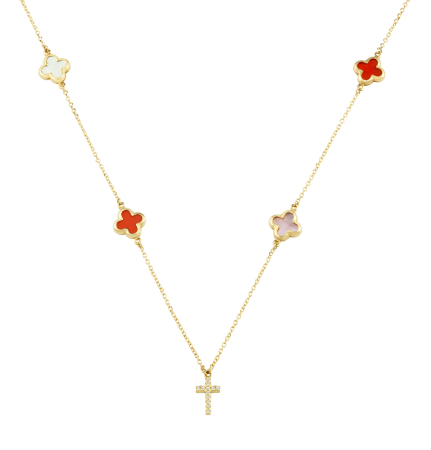 Κολιέ σε κίτρινο χρυσό με στοιχείo σταυρό, ζιργκόν κοράλλι και φίλντισι.