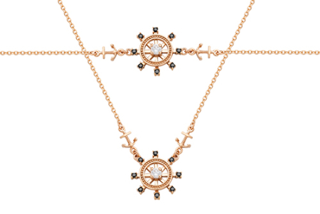Κολιέ - βραχιόλι σε ροζ χρυσό με λευκά και μαύρα ζιργκόν και στοιχείο πηδάλιο. Διατίθεται και σε λευκά ζιργκόν με τυρκουάζ.