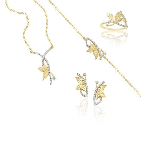 Καδενωτό Σετ Σε Κίτρινο Χρυσό με στοιχεία φύλλα και λευκά ζιργκόν.
