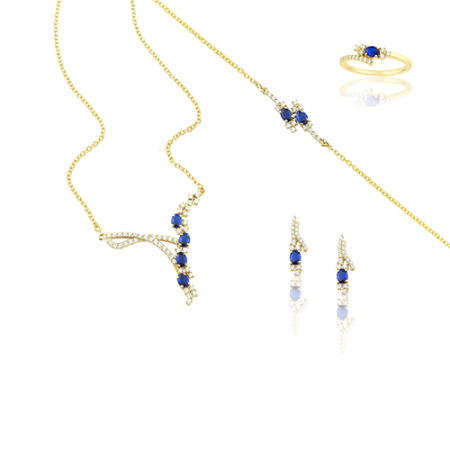 Σετ Ροζέτες Σε Κίτρινο Χρυσό μπλε και λευκά ζιργκόν, διαθέσιμο σε ποικίλους χρωματικούς συνδυασμούς πετρών.