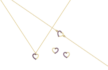 Κολιέ - Βραχιόλι - Σκουλαρίκια σε κίτρινο χρυσό με στοιχείο καρδιά και ροζ με λευκά ζιργκόν, διαθέσιμο και με λευκά ζιργκόν.