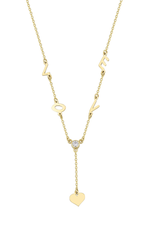 Κολιέ σε κίτρινο χρυσό με τη λέξη "love", λευκά ζιργκόν και κρεμαστό στοιχείο καρδιά.