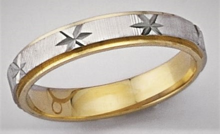 Βέρα δίχρωμη σε λευκό χρυσό με χαράγματα αστεροειδούς σχήματος και κίτρινες γυαλιστερές άκρες.