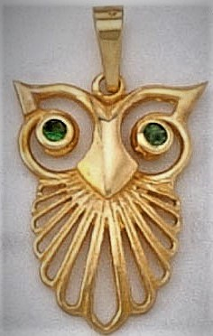Μενταγιόν κουκουβάγια σε κίτρινο χρυσό με μπλε, πράσινα ή κόκκινα ζιργκόν, με βάρη από 1,70 ως 2,90 γρ. Διαθέσιμο και χωρίς πέτρες.