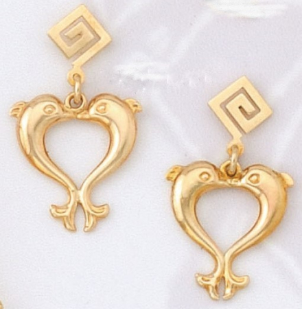 Σκουλαρίκια με δελφίνια αντικριστά σε σχήμα καρδιάς σε κίτρινο χρυσό.