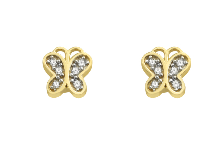 Σκουλαρίκια καρφωτά σε κίτρινο χρυσό με λευκά ζιργκόν σε σχήμα πεταλούδα