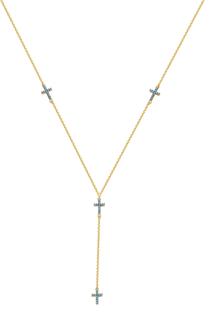 Κολιέ σε κίτρινο χρυσό με στοιχείο σταυρό και γαλάζια ζιργκόν δύο όψεων. Διατίθεται και σε ροζ χρυσό με μαύρα ζιργκόν.