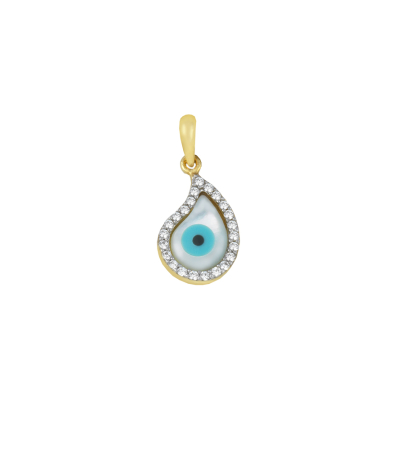 Μενταγιόν ματάκι σε κίτρινο χρυσό με λευκά ζιργκόν και φίλντισι.