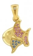 Μενταγιόν σε σχήμα ψαριού σε κίτρινο χρυσό με ροζ και μπλε ζιργκόν. Διαθέσιμο και με λευκά ζιργκόν.