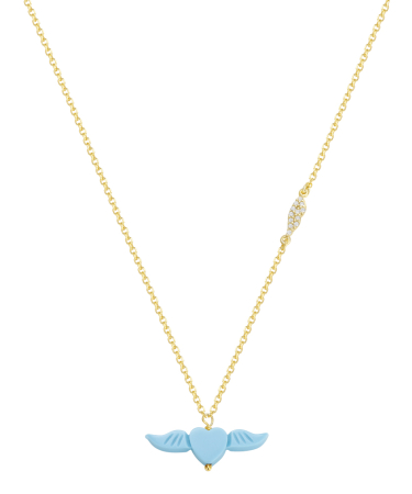 Κολιέ σε κίτρινο χρυσό με ζιργκόν και στοιχείο καρδιά με φτερά τυρκουάζ.